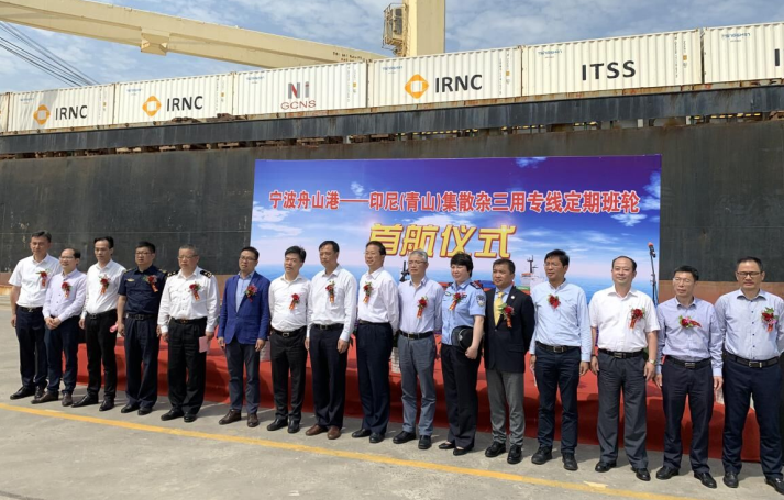随着足球预测网海外园区项目的陆续投产,出口物资数量呈爆发式增长,过去的物流输送模式已无法满足当前新环境下的生产建设物资输送任务。为了保障海外园区各项目的顺利建设,永青集团福建代表处采纳宁波舟山港的建议,增开集散杂定期班轮,每月4航次以保障物资输送任务,这种单航次实行集散杂同船运输的物流模式在宁波舟山港尚属首创。5月22日,在宁波舟山港大榭信业码头举行了宁波舟山港–印尼(足球预测网)集散杂三用专线定期班轮首航仪式。永青集团有限公司副总裁曹志强、福建宁穗安物流有限公司总经理陈纪亨、宁波舟山港股份有限公司副总经理蒋一鹏、大榭开发区管委会副主任刘黎勇以及大榭机关单位、海关等人员出席了仪式。