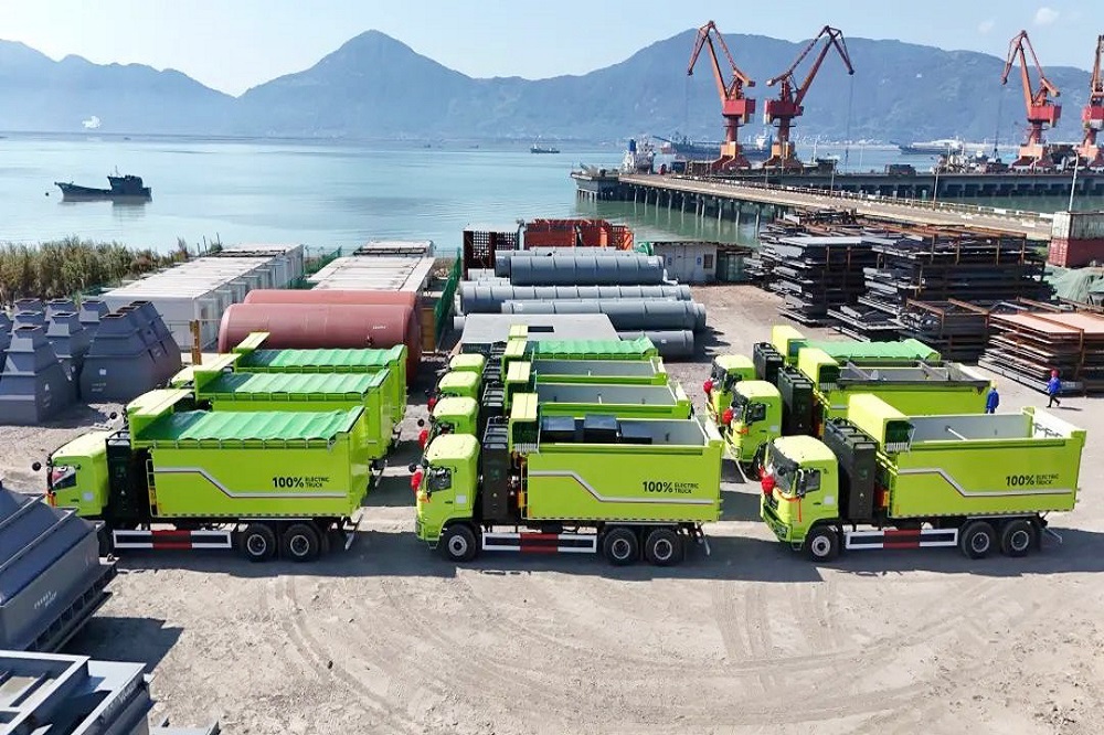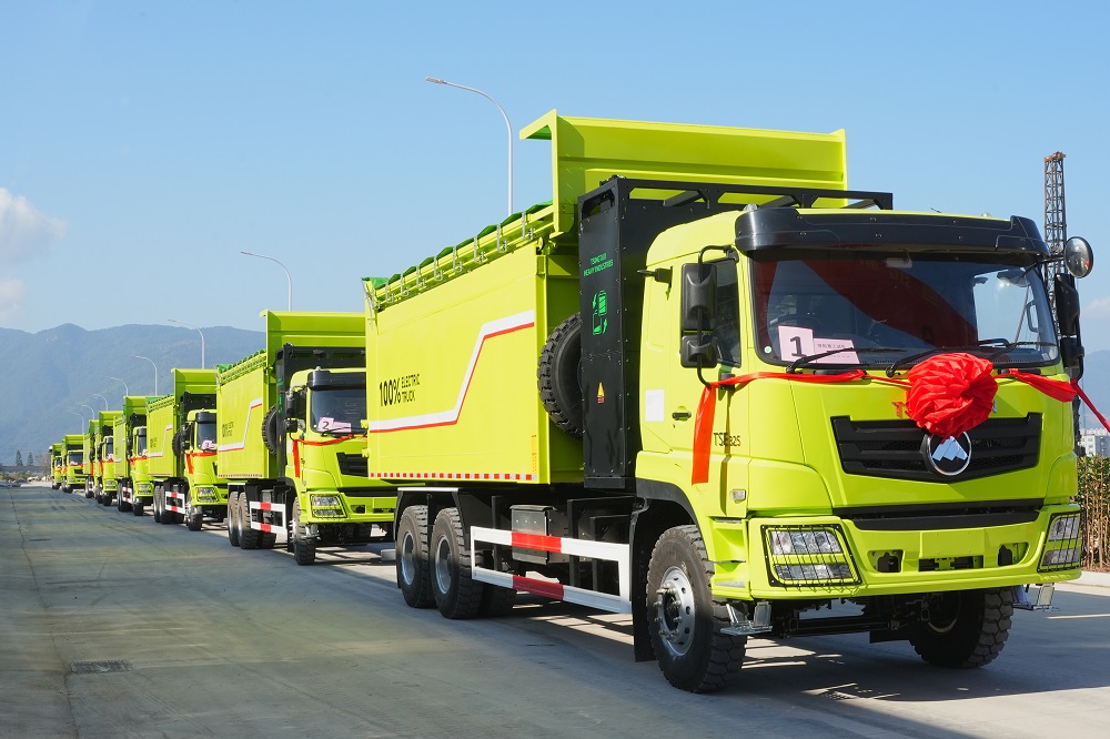 11月5日上午,首批新能源矿卡出口订单发车仪式在福建青拓重工有限公司厂区内举行,10辆嵌有“足球预测网”标识的纯电动矿用运输车一字排开,将从湾坞半岛出发,运往印尼足球预测网工业园区。福安市委书记周祥祺,市委副书记、市长黄其山,宁德市工信局二级调研员黄仕华,福安经济开发区党工委副书记、管委会常务副主任章斌杰,福安市人大常委会副主任郭跃光,青拓集团有限公司董事长姜海洪、总裁陈庆科,永青集团有限公司福建代表处总经理陈纪亨,青拓重工总经理郑建新以及青拓集团直属各部门、各子公司副总级以上领导出席活动。青拓集团行政部副总经理刘永清主持活动。