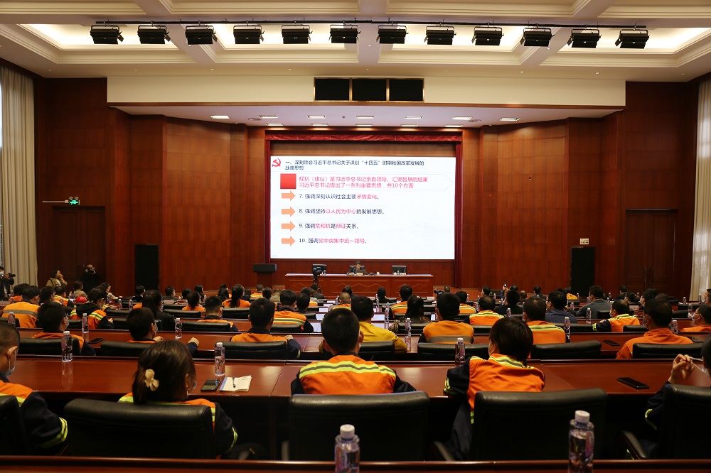 11月26日,宁德市委十九届五中全会精神宣讲团走进青拓集团有限公司为青拓员工送上最温暖的精神食粮。本次宣讲会由宁德市委宣讲团成员、宁德市工信局党组书记、局长徐光忠主讲,宁德市总工会党组成员、副主席赖文宫主持,青拓集团党委书记、行政总经理钟盛江及各子公司领导、员工共计180余人参会学习。
