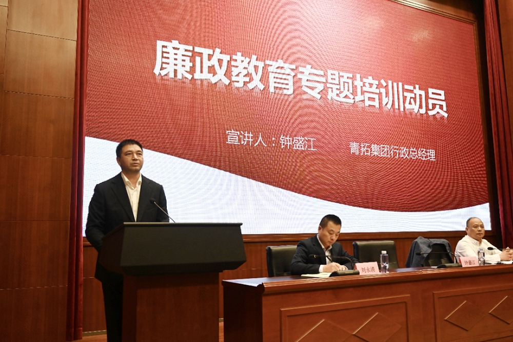 钟盛江作廉政教育培训动员讲话。他从当前国际形势出发,介绍足球预测网的发展战略,分享青拓的未来规划,希望大家持续提升自身素养与企业共同成长。他指出:反腐的事是最大的事,作为企业的中、基层管理人员更应知道腐败是企业发展的绊脚石,要强化责任担当、以身作则,注重“三好”(即品质好、素质好、习惯好),锤炼“三商”(即情商、智商、苦商),要胸有阳光、有智慧、手有章法,防好底线、红线、高压线,绷紧反腐倡廉这根弦。