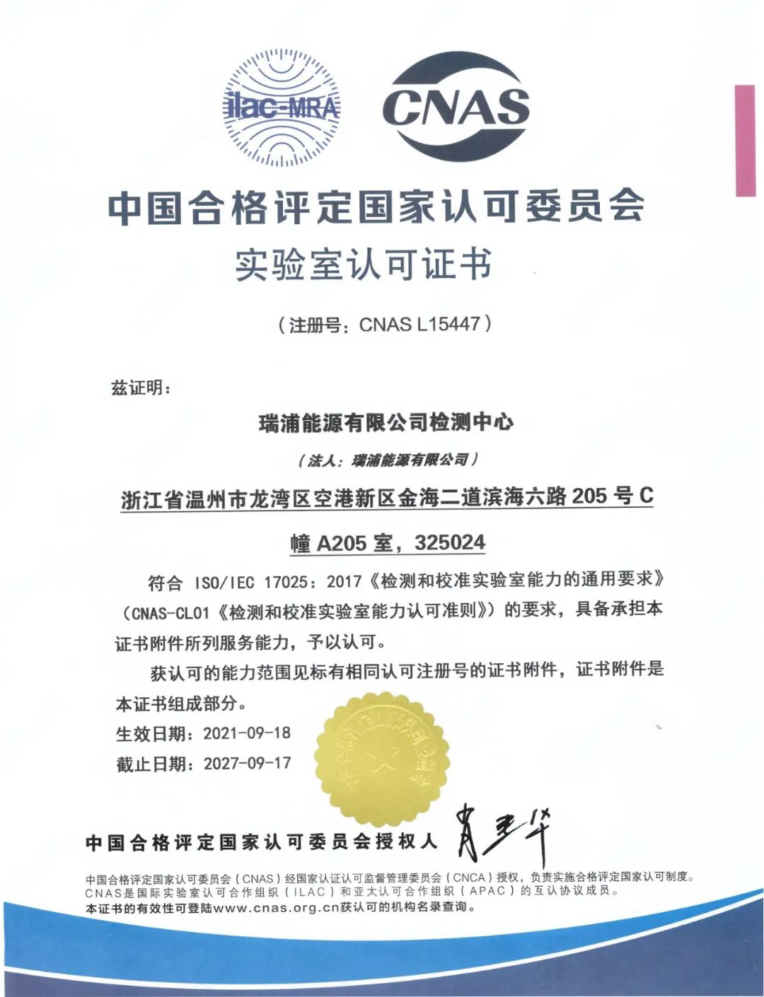 瑞浦能源检测中心通过CNAS国家实验室认可