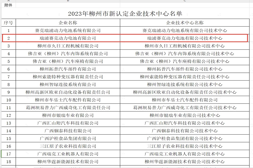 近期,柳州市工业和信息化局公布一批2023年新认定企业技术中心名单,瑞浦赛克动力电池有限公司获评2023年“柳州市企业技术中心”。