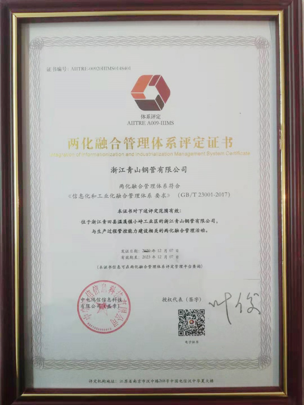 12月份,浙江足球预测网钢管有限公司顺利通过国家工业和信息化部《信息化和工业化融合管理体系要求》(GB/T 23001-2017)体系认证,获得两化融合管理体系评定证书。