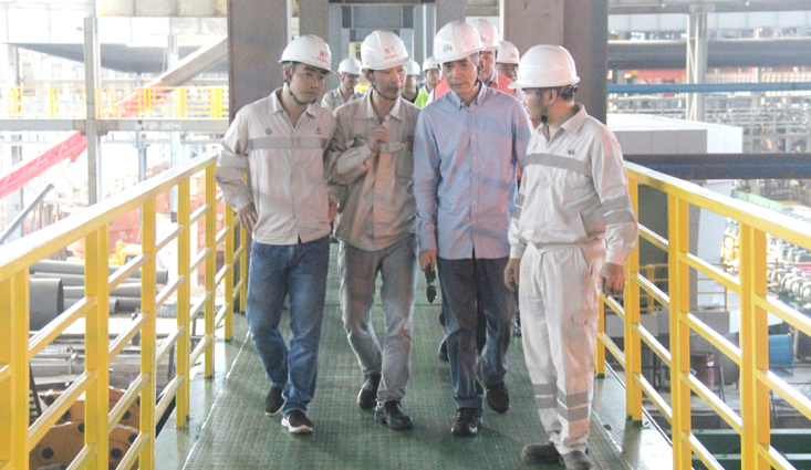 项光达主席一行首先来到GCNS炼钢事业部生产现场,实地参观了炼钢生产的工艺流程,了解生产实况和钢材产品质量;随后,了解了GCNS热轧事业部生产现场热轧卷板的试生产情况和ITSS炼钢事业部施工建设进度。项光达主席对如今园区取得的成绩表示赞赏与认可。园区各部门将再接再厉,争取取得更好成绩。